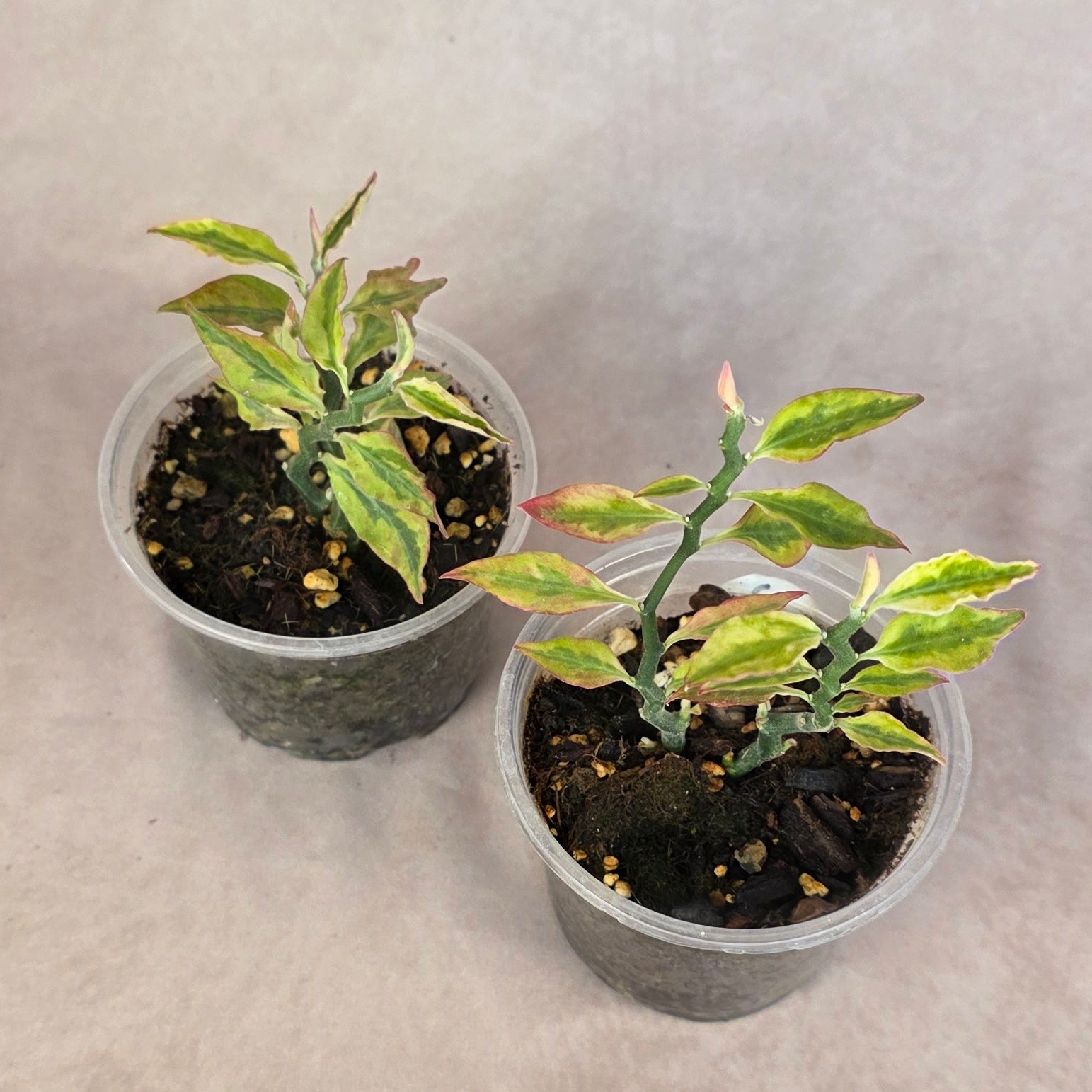 • Variegated leaves that can sun-stress pink in bright light